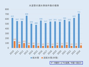 ちなみに、漏水事故発生状況についてデータ提供を求めてグラフ化してみました。2010年以来、配水管(本管)の事故は減っているのに、今回のような家庭への給水管の事故は増加傾向です。