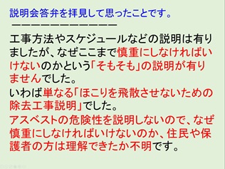 今日は決算委員会分科会で文教委員会所管事項を審議。私が議論したのは、7月24日に開催された登美丘西小学校の吹付アスベスト除去工事の説明会についてです。当日取材されていた石綿ジャーナリスト・井部正之さんの記事を参考に、説明会の課題について指摘。また、アスベスト患者と家族の会・連絡会の古川和子さんから寄せられた意見も伝えました。市教委の担当者は、保護者や患者と家族の会から提出されている要請事項に対して、「できる限り児童や保護者に寄り添い、真摯に対応したい」と答えました。