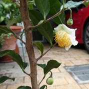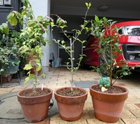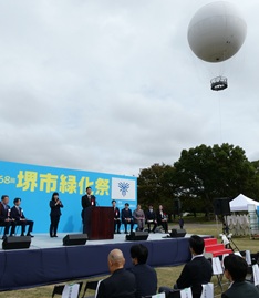 「雨の中で準備に当たる職員を慰労しよう」と大仙公園の緑化祭へ。結局、天候は職員に味方しました。ボランティア団体のテントで100円のムクゲ苗木を2本購入。堺ライオンズクラブ寄贈のチャノキもいただいたので、事務所に戻って植え替えました。
