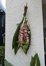 なお、昨日、事務所前の花鉢入れ替えの際にモモシキブやムラサキシキブを剪定。切り取った枝を素材にして、妻が花飾りを作りました。玄関の柱に飾っています。