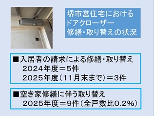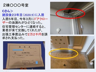 最初に議論したのは、その市営長曽根団地で最近発生したドアクローザーの修繕費用についての話です。木造市営住宅を建て替えて同団地が開設されたのは、1997年。2020年(築後23年)に入居したCさん宅の玄関扉のドアクローザが今年3月に不具合を発生。管理センターの紹介業者が取り替えに来て、2万2千円を支払いました。