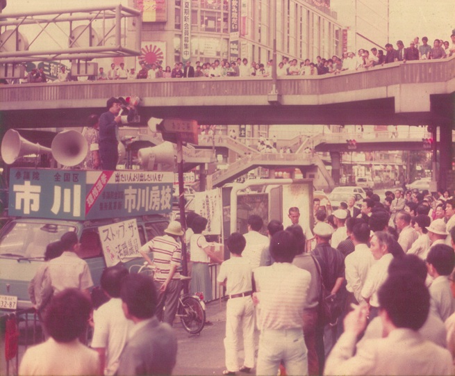 選挙カーの上でマイクを握っているのは、市川選挙の大阪事務所長を務めていた私。車上には豊中市議(当時)の飯田しづえさんも立っています。候補者は不在。私たち2人だけでの訴えだったのに、これほどたくさんの方々が耳を傾けてくださいました。1時間余りの演説が終わっても人々は動こうとせず、私は「アンコール演説」を続けざるを得なかったのです。