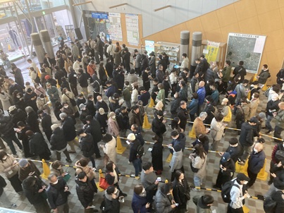 北図書館から「予約図書が届いた」との連絡があったので、貸出を受けに行って驚きした。区役所1階のホールに、何重にも長蛇の列ができています。今日が最終日となった期日前投票に来られた方々です。