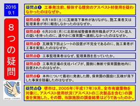 こんな情けない事態を踏まえての「認識」を問うた市長は、「危機感を持って対策を強化」し、「庁内ルールを見直し、全職員が強い意識で臨む」、「アスベスト対策を形骸化させず、全庁的に知識・認識の周知徹底を図る」などと表明しました。