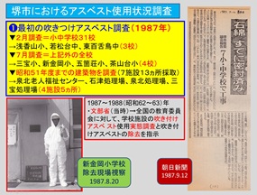 私が初めてアスベスト行政の議論を挑んだのは、1987年のこと。文部省の指示で調査した吹付アスベストが4校で見つかり、除去工事の現場にも防護服を着て入りました。この折の教育委員会幹部の答弁も「認識していなかった」でした。つまり、30年以上にわたって市幹部の「認識不足」が続き、「アスベスト事件」が繰り返されてきた訳です。