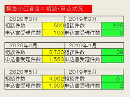 ところが、別に提供を求めた緊急小口資金(取り扱い=社会福祉協議会)の相談・申込状況をみると、下の図のように激増しています。4月、5月の相談件数は前年の10倍近い数字を示し、昨年1~2件だった受理件数は4月1563件、5月1909件と爆増。生保に至るまでの救済・支援制度として活用されたことが窺えます。