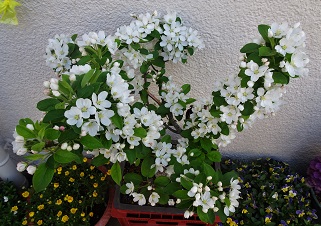 ご近所のTさんが長年手塩にかけて来られた盆栽をお預かりしているのですが、その一鉢の姫リンゴが見事に花を付けています。