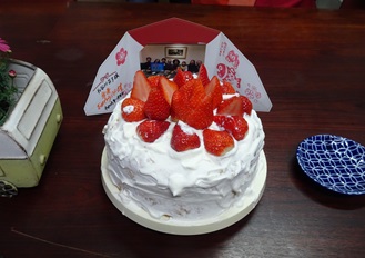 また、夜は息子と娘の一家が妻の傘寿と私の退院を祝う会を催してくれました。娘は子どもの頃に妻が作っていたレシピどおりにケーキを自作して持参。とても懐かしいおいしさを、みんなで味わうことができました。なお、「祝傘寿」のパネルは息子が制作してくれたものです。
