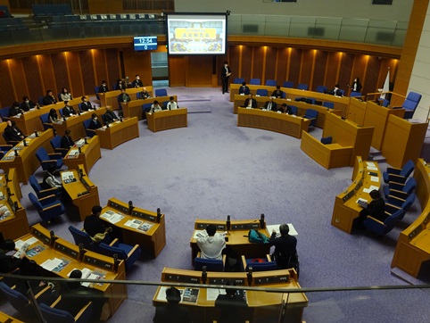 午後、若者の政治参画などテーマとする議会報告会に傍聴参加しました。本会議場で議会の役割などについて説明の後、委員会室や会議室で意見交換。参加市民は中学生1人、高校生21人、大学生8人、一般9人で合計39人。傍聴に来られた市民も13人ありました。