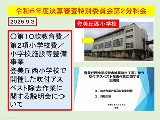 今日は決算委員会分科会で文教委員会所管事項を審議。私が議論したのは、7月24日に開催された登美丘西小学校の吹付アスベスト除去工事の説明会についてです。当日取材されていた石綿ジャーナリスト・井部正之さんの記事を参考に、説明会の課題について指摘。また、アスベスト患者と家族の会・連絡会の古川和子さんから寄せられた意見も伝えました。市教委の担当者は、保護者や患者と家族の会から提出されている要請事項に対して、「できる限り児童や保護者に寄り添い、真摯に対応したい」と答えました。