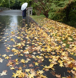 朝、時折に雨が降る大泉緑地を歩きました。実に3週間ぶりですから、各所で秋の景色に出会います。