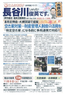 印刷所から、「議員活動報告」№104が納品されました。明朝から始める駅前議会報告で配布させていただくつもりです。なお、今週の駅前報告は、7日(火)新金岡駅①②出入口、8日(水)新金岡駅②③出入口、9日(木)新金岡駅④出入口で行わせていただこうと思っています。