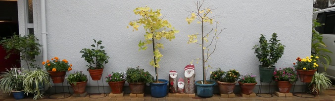 秋が深まり、参議院議長公邸のギンナンから育てたイチョウも散り始めました。鉢のそばに飾っていたハロウィンかぼちゃは、先日から切り株サンタに置き換えています。