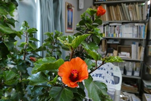 ※先日事務所内に移してやったハイビスカスが花を開きました。黄色だったはずの花がオレンジ色に。