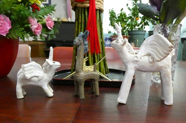 毎年末、翌年の干支をモチーフにした作品を制作されている南区在住の陶芸家・佐藤美枝子さんから今年の作品をいただきました。実は昨日、わざわざお届け下さった折に外出していて、お目にかかることができず、申し訳ない思いを抱きながら、「門梅」の前に飾らせてもらいました。